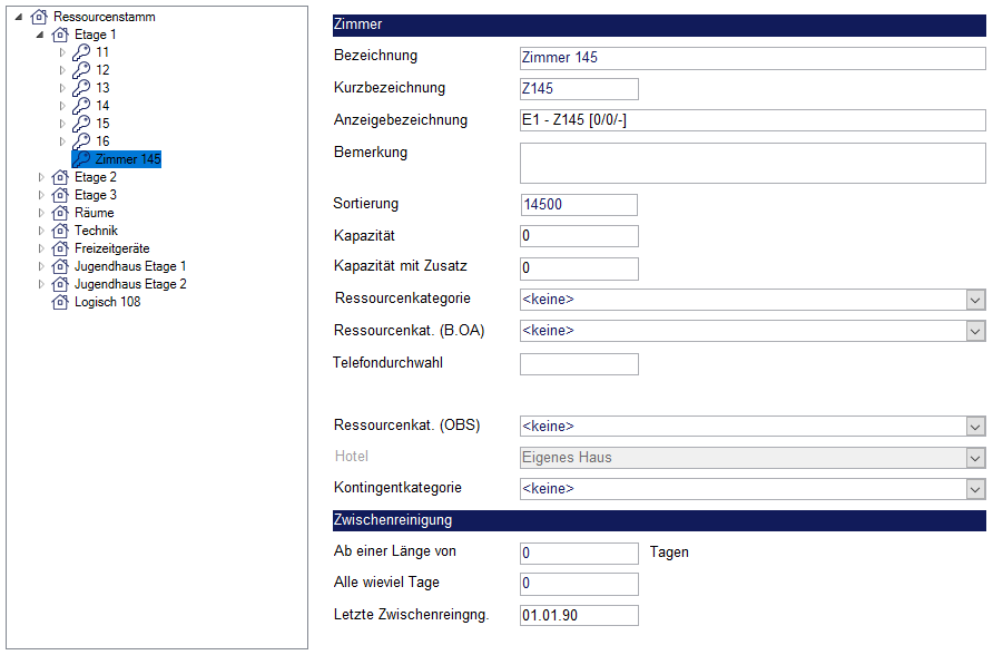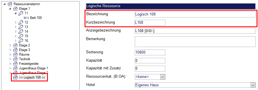 Die Felder „Anzeigebezeichnung“ und „Sortierung“ werden automatisch gefüllt. Die Anzeigebezeichnung setzt sich aus dem Kürzel der logischen Ressource, des Zimmers, sowie der Zimmerkapazität und -kategorie zusammen. Die Bezeichnung „E1 - 11 [1/2/EZ]“ sagt z. B. aus, dass es das Zimmer 11 in der Etage 1 ist. Im Zimmer ist 1 Bett, mit Zusatzkapazität 2 Betten und es hat die Kategorie „Einzelzimmer“.