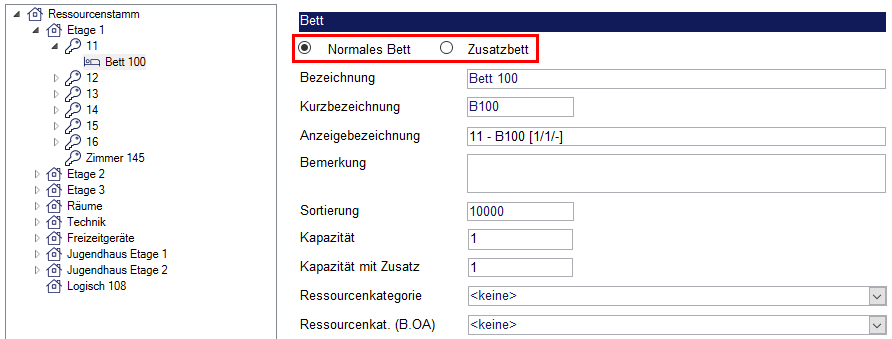 Die Felder im rechten Bereich sind analog zu denen einer Zimmerressource. Bei Bedarf können Betten benannt und Bemerkungen hinzugefügt werden. Je Bett kann zusätzlich festgelegt werden, ob es sich um ein normales Bett oder ein Zusatzbett handelt.