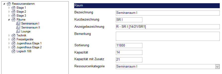 Wie bei anderen Ressourcen wird bei Räumen und Technik ebenfalls eine Bezeichnung und ein Kürzel vergeben, außerdem stehen auch Ressourcenkategorien Verfügung.