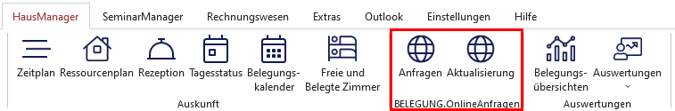 Bei Nutzung des Moduls BELEGUNG.OnlineAnfragen finden Sie im Menü „HausManager“ die Schalter „Anfragen“ und „Aktualisierung“. Der Schalter „Aktualisierung“ führt zwei Aktionen durch:
