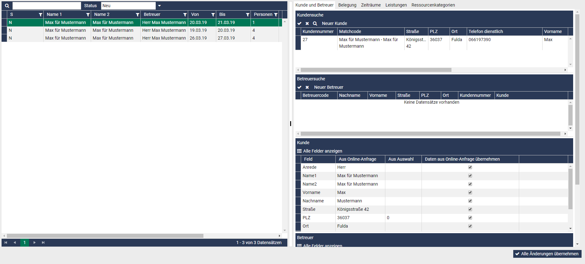 Die Verarbeitung der Anfragen in Kunden, Betreuer und Belegungen kann durch den Schalter „Alle Änderungen übernehmen“ durchgeführt werden. Dabei werden Anfragen mit dem Status „Neu“ nicht beachtet. Hier werden dann die Felder der Kunden und Betreuer der übernommenen Anfragen nach dessen Feldern überarbeitet und eine neue Belegung wird angelegt.