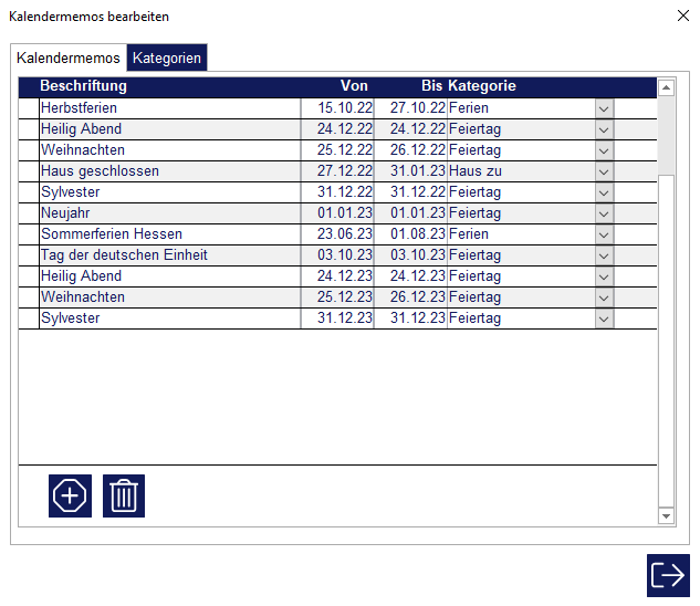 Hierbei gilt es zu beachten, dass Sie die Kategorie auswählen, welche auch als Sperrkategorie in den Programmeinstellungen von BELEGUNG.OnlineAnfragen hinterlegt ist. Sollten Sie noch keine entsprechende Kategorie angelegt haben, geht dies über den Karteireiter „Kategorien“ in der „Kalendermemos bearbeiten“-Maske. Hier können Sie auch über das grüne Plus-Symbol eine neue Kategorie anlegen, und dieser eine entsprechende Bezeichnung geben.