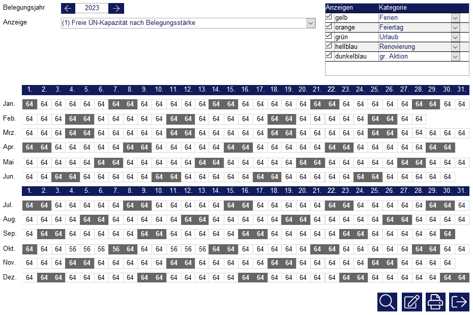 Öffnen Sie dafür zuerst den Belegungskalender unter „HausManager“ > „Belegungskalender“. Dort finden sie auf der rechten unteren Seite die Möglichkeit, Kalendermemos und Kategorien einzurichten. Klicken Sie hierfür auf das im Screenshot rot markierte Symbol.