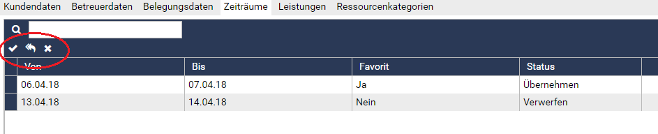 Der Status einer Anfrage kann durch den unteren Detailbereich im Register Zeiträume geändert werden. Durch die Schalter dieser Liste können den Anfragen die verschiedenen Status „Neu“, „Verwerfen“ und „Übernommen“ zugeordnet werden. Im Reiter Leistungen und Ressourcenkategorien können die gewünschten Ressourcenkategorien eingesehen werden.