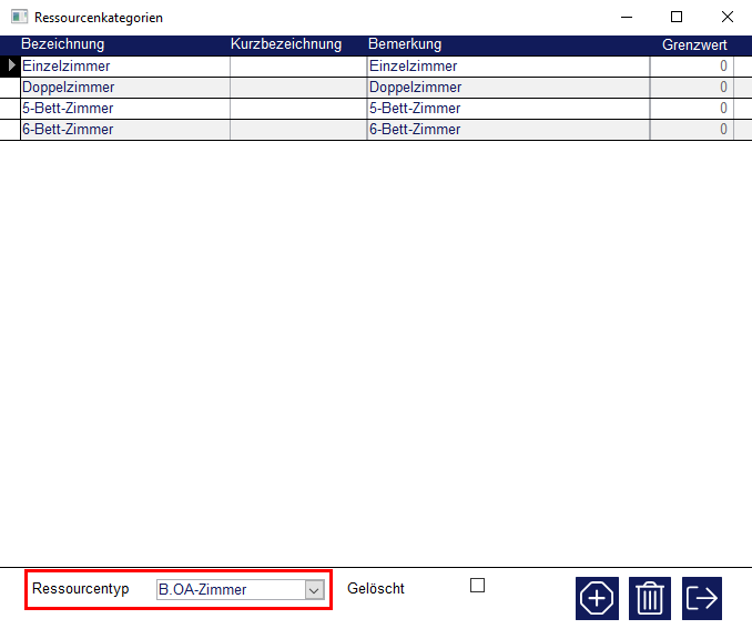 Eine Ressourcenkategorie für BELEGUNG.OnlineAnfragen kann im Ressourcenstamm unter dem Schalter Ressourcenkategorien angelegt werden. Dort muss über das Auswahlfeld des Ressourcentyps ein BELEGUNG.OnlineAnfragen-Ressourcentyp ausgewählt werden. Danach können die verschiedenen Ressourcenkategorien für BELEGUNG.OnlineAnfragen angelegt werden. Auch bereits gelöschte Ressourcenkategorien können hier angezeigt werden.