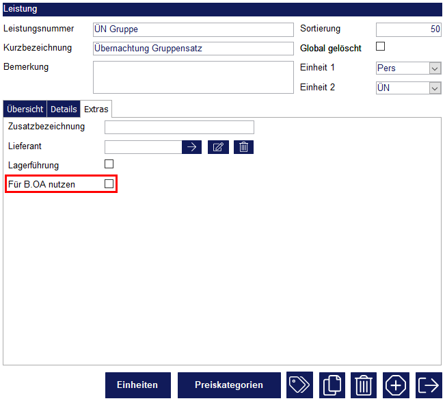 Das Häkchen für den „Für B.OA nutzen“ kann im Leistungsstamm bei einer Leistung unter dem Reiter „Extras“ gefunden werden. Auch die Zusatzleistungen werden bei Betätigen der Aktualisierung von BELEGUNG.OnlineAnfragen aktualisiert und auf der Internetseite angezeigt. Dabei werden alle Leistungen inklusive Preiskategorie hochgeladen, deren Preiskategorie nicht gelöscht oder ausgeblendet ist.