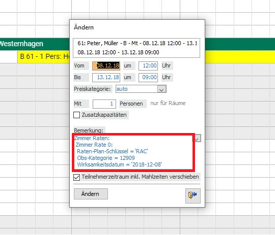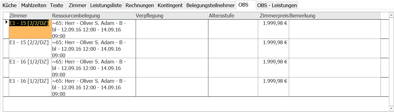 Unter Karteireiter „BPS“ erhalten Sie hierbei Informationen über die gebuchten Zimmer zzgl. der dazugehörigen Verpflegung, Altersstufe, dem Zimmerpreis und der hinterlegten Bemerkung. Die Zimmer sind im Ressourcenplan als Blockungen zugeteilt.