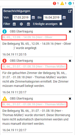 Die Information, erkennbar am blauen „i“, besagt, dass die Belegung mit dem Belegungscode 65 für den Kunden Herrn Oliver im HausManager angelegt wurde. Weiterhin gibt es für die Belegung 66 eine Fehlermeldung (Ausrufezeichen), die besagt, dass nicht alle Zimmerkategorien ermittelt werden konnten. In diesem Fall müssen die Zimmer anhand der Informationen der zugehörigen Belegung manuell geblockt oder zugeteilt werden. Zu guter Letzt besagt die unterste Meldung, eine Warnung, dass die Buchung durch den Gast storniert wurde. In diesem Fall muss die Stornierung auch manuell vorgenommen werden.