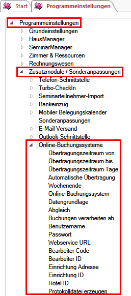 Die relevanten Programmeinstellungen finden Sie anschließend unter den Punkten „Programmeinstellungen“ > „Zusatzmodule / Sonderanpassungen“ > „Online Buchungssysteme“.