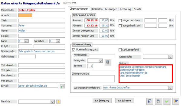 Die Kontaktdaten des Gastes werden im HausManager als Kundendatensatz angelegt. Im Falle eines Neukunden wird dieser neu angelegt. Sollte der Gast bereits im Kundenstamm hinterlegt sein, so wird dies mit Hilfe eines Dublettenabgleichs erkannt, und es wird ausschließlich die neue Belegung mit den zugehörigen Zimmerblockungen angelegt.