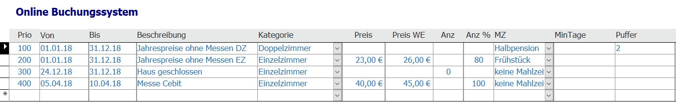 - Prio: Die Priorität. Diese gibt an, in welcher Reihenfolge die Übertragungen durchgeführt werden. Regeln mit niedriger Priorität werden vor Regeln mit großer Priorität abgearbeitet. Da automatisch nach dieser Spalte Prio sortiert wird, werden die Regeln entsprechend von oben nach unten abgearbeitet. Auf diese Weise können kleinere Zeiträume, die innerhalb eines größeren Zeitraumes liegen eine höhere Priorität erhalten. Im obigen Beispiel ist unter Prio 200 definiert, dass ein Einzelzimmer im Jahr 2018 zu einem Preis von 23,00 Euro angeboten wird. Dieser Preis gilt jedoch nicht für den Zeitraum der Cebit vom 05.04.18 bis 10.04.18. Aus diesem Grund hat die Regel „Messe Cebit“ eine höhere Priorität. Hierdurch gilt für Buchungen im Zeitraum der Cebit ein Einzelzimmerpreis von 40,00 Euro. Ausnahmen müssen also immer unter der allgemeineren „Hauptregel“ stehen.