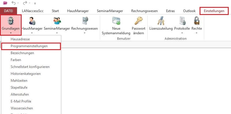 Zunächst müssen in den Programmeinstellungen entsprechende Daten hinterlegt werden, die vom Anbieter des ChannelManagers bereitgestellt werden. Öffnen Sie hierzu die Programmeinstellungen über Karteireiter „Einstellungen“ > „Grundlagen“ > „Programmeinstellungen“.