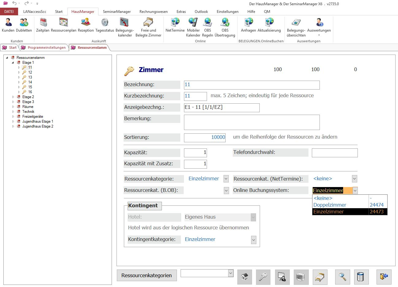 Nachdem die Ressourcenkategorien definiert wurden, müssen diese im nächsten Schritt den bisherigen Zimmern, die im Ressourcenstamm angelegt wurden, zugeordnet werden. Öffnen Sie hierzu den Ressourcenstamm (Karteireiter „Einstellungen“ > „HausManager“ > „Ressourcenstamm“). Wählen Sie anschließend das Zimmer aus, welches Sie bearbeiten möchten und wählen Sie unter „Online Buchungssystem“ die zuzuteilende Kategorie aus.