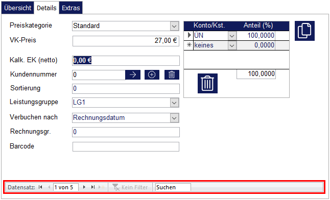 Wählen Sie nun auf der linken Seite die jeweilige Leistung aus und wechseln Sie auf der rechten Seite auf den Karteireiter „Details“. Auf der rechten Seite der Details finden sie nun die Anzeige zur Hinterlegung der Fibukonten.