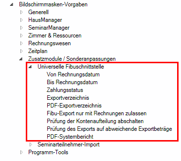 In den Programmeinstellungen ist unter „Bildschirmmasken-Vorgaben“ > „Zusatzmodule/Sonderanpassungen“ der Punkt „Universelle Fibuschnittstelle“ zu finden. Über die Programmeinstellungen können verschiedene Felder vordefiniert werden, damit sie nicht bei jedem FiBu-Export erneut angegeben werden müssen.