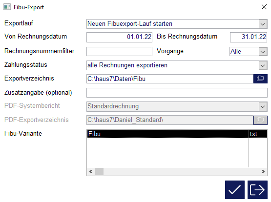 - Von Rechnungsdatum und Bis Rechnungsdatum: Das System merkt sich hier automatisch den Zeitraum, den Sie als letztes für den FiBu-Export genutzt haben.